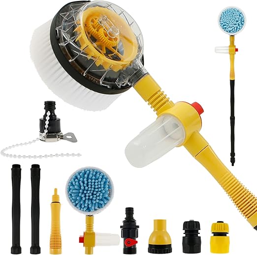 • 360 Rotating Car Wash Brush Connect the car wash brush mop to a 1/2" (DN15) garden hose (not including hose) and when you turn on the tap, the brush head will automatically rotate under water pressure without any power supply. The brush will auto 360 rotating, help you easily wipe away all dirt and dust, saving you time and effort, and making cleaning easier.