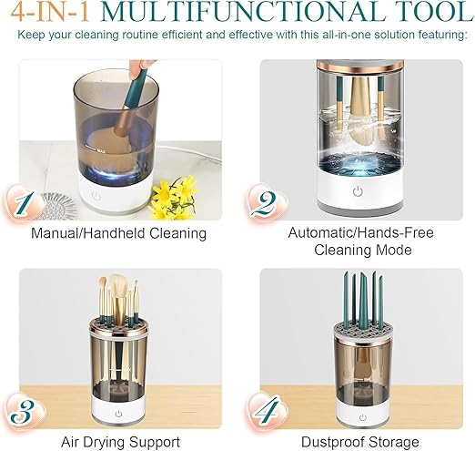 Makeup Brush Cleaner, Makeup Brush Cleaning Machine, Waterproof Automatic Makeup Brush Cleaner for Makeup Sponges and Brushes Deep Cleaning Action Removes dirt, oil, and makeup residue from bristles thoroughly.Durable & Compact Lightweight yet sturdy, perfect for home use or travel.Electric Makeup Brush Cleaner Clean & Dry in Seconds! Keep your makeup brushes spotless with our Electric Makeup Brush Cleaner, designed to make brush cleaning effortless, fast, and hygienic. Say goodbye to time-consuming hand washing and hello to sparkling clean brushes in underWhat's Included a minute! USB Power Cable & Easy to Use Using USB plug-and-play power cable can clean your makeup brush set directly. No assembly required, one button control switch, easy to operate. Switch is sensitive, please restart by mistake. Easy to Use 1. Add water and cleanser until the container is half full. 2. Press the button to turn it onoff 3. Gently press down the brush. 4. Rinse bristles with clean water. What's Included 1 Electric Brush Cleaner Spinner USB Charging Cable Upgrade your beauty routine today and enjoy perfectly clean brushes anytime! Perfect gift for birthday, anniversary, women's day, valentine's day. Suitable for professional makeup artists, and makeup lovers.