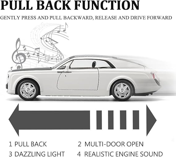 • 【Rolls-Royce Sweptail Model Car Toy】Size: 7.9*2.8*2.4inches, 0.9 pounds. The collectible Rolls-Royce car is packaged in a exquisite color translucent packaging box. The toy car has special realistic engine sound and dazzling lights for a real experience that all kids will love. And has a pull-back system that allows it to catch great speeds.